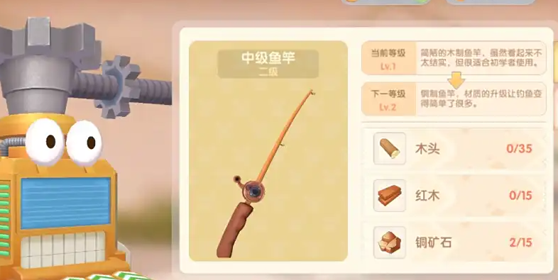 更换中级鱼竿其实很简单,只需要达到18级就能解锁这个功能啦。这时候咱们可以去找梅森小屋的大眼睛机器人,它会帮咱们把初级鱼竿升级成中级鱼竿。不过升级可不是免费的,得准备好35个木材、15个红木、15个铜矿石和600个摩尔豆才行。这些材料平时多收集一点,到时候就能直接升级不用等啦。