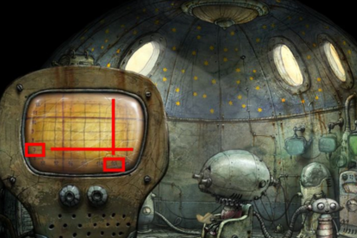 玩家需要解开一个复杂的锁机制才能继续推进剧情。首先回到大头机器人所场景,带着同伴向右移动,在左侧会发现一个开关,按下后会出现一个类似乐器的装置,上面标注着7.0:108的数值。需要返回大头机器人处,点击黄色表盘,将横竖坐标调整为7和108,记录下显示的旋律。这一步骤是解开锁的关键前提,必须确保坐标调整准确无误。