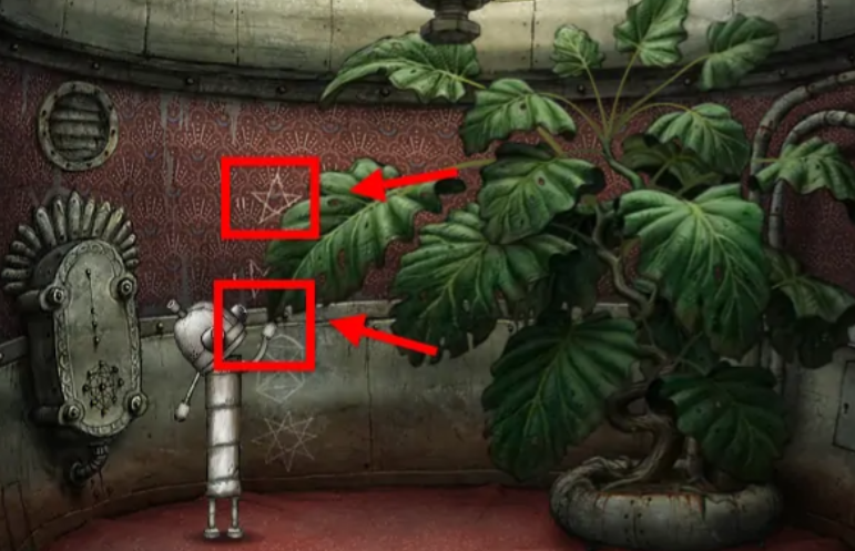 当两个灯泡都安装到位后,记得观察植物顶部的符文图案。拉长身体拨开植物叶子,能看到最上方是五角星形状,按照这个图案在表盘上排列灯泡就能激活电梯。如果排列错误,按中间按钮重置即可。完成图案后电梯会启动,这时点击画面下部中间的箭头就能进入下一场景。