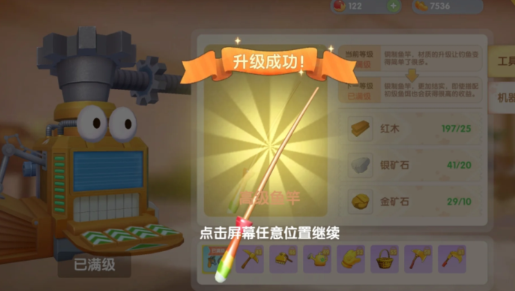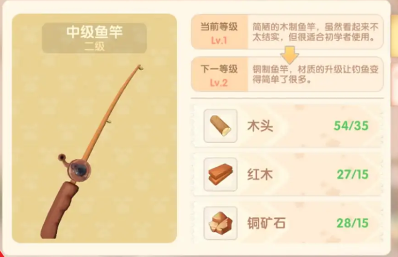 制作鱼竿,首先得准备好基础材料。初级鱼竿可以通过修复家园河边的破损木桥免费获得,这是新手小摩尔最容易入手的钓鱼工具。如果想升级更高级的鱼竿,就需要前往梅森小屋,找到里面的机器人进行升级,材料包括木头、红木、铜矿石和摩尔豆。