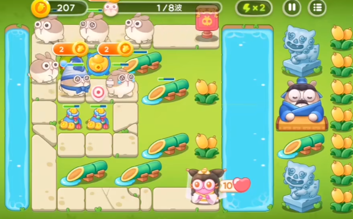 开局咱们先在左上角放一个元宝和一个飞镖,这两个炮塔能帮你稳稳度过第一波。元宝打钱快,飞镖清怪效率高,搭配起来特别顺手。第二波来了记得在中左位置补个飞机,旁边再放个元宝,这样火力就够用了。前期重点是多打钱袋子和道具,攒够钱才能布置更多炮塔。