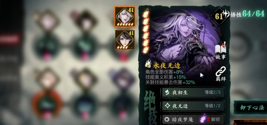 副心法的选择需结合角色定位和战斗需求。基础属性增益类心法(如攻击力、暴击率提升)适合作为副心法,而依赖羁绊效果或特殊技能的心法则建议保留为主心法。部分橙色品质心法如永夜无边,虽无法触发羁绊,但其基础属性与绝技(如杀意生成、幻境控制)仍能显著提升战斗效率。