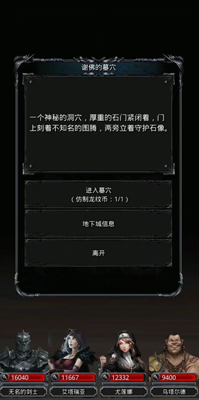 墓葬是地下城堡2中位于图11的一个副本,具体坐标是45,22,要进入墓葬副本,首先需要在市场中花费5000金币购买龙纹银币,然后前往图4正右方的据点完成挑战,从而获取仿制龙纹硬币的蓝图。在工坊中使用铁18000、秘银2600和强者血液3个材料制作仿制龙纹硬币,制作完成后就可以前往图11的指定位置使用硬币进入副本。如果挑战失败,当天还可以消耗300食物再次尝试,副本的进入条件还包括队伍中至少一名英雄的技巧高于465点、速度高于400点,其他成员技巧高于315点,否则无法成功进入。