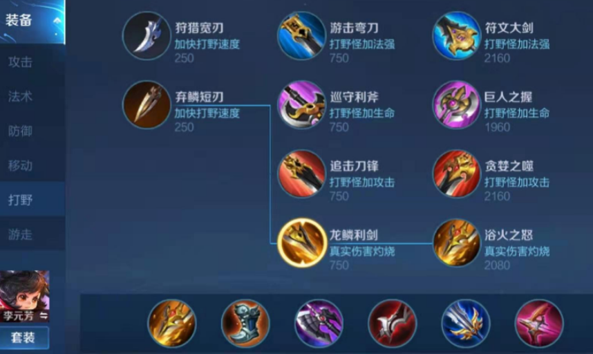 李元芳打野核心就是快,刷野快、抓人快、推塔也要快,所以他特别需要攻击速度、物理攻击和暴击这几样东西。一套常见的出装顺序是这样的:开局先买狩猎宽刃,然后合成追击刀锋或者贪婪之噬来提升打野效率。鞋子方面,如果对面控制技能不多,就选急速战靴加攻速;要是对面控住你就不放,那抵抗之靴能让你更灵活。接下来是关键的攻击装,暗影战斧是个好选择,它提供冷却缩减和物理穿透,让你技能转得快,打人更疼。然后是泣血之刃,这件装备能提供物理吸血,让你打完野怪或者小规模打架后不用总回城,续航能力大大增强。再往后可以出无尽战刃,这是提升暴击伤害的核心,出了之后李元芳的爆发会高一个档次。最后两件装备通常考虑破晓和破军,破晓是针对后期坦克护甲高的,提供高额护甲穿透和攻速;破军则是为了收割残血,伤害最大化。当然到了大后期,打野刀可以卖掉换成保命装备,比如名刀·司命或者贤者的庇护。