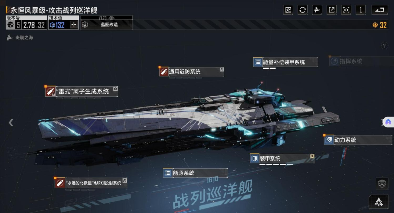 装甲系统的加点也有讲究,毕竟再猛的输出也得站得住才行。建议优先提升能量抗性,其次是护甲和减命中,最后再考虑生命值。主炮结构也是不能忽略的,毕竟这关系到咱们的持续作战能力。如果技术点有富余,可以适当点一些机动性,这样在战场上能更灵活地调整位置。不过永恒风暴的速度在战巡里已经算快的了,所以机动性加点的优先级可以稍微放低一点。
