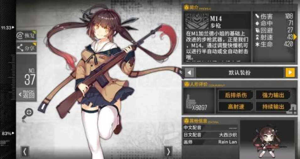 M14作为少女前线中性价比极高的三星步枪人形,其专属装备UsrA1快慢机通过心智升级MOD3解锁,核心属性为命中+10和暴击概率+48%。该装备本质上是针对M14特调的扩充升级芯片,在提升基础性能的同时解决了电子战人形无法安装复杂火控的技术难题。从实战价值来看,专属装备对M14的输出能力属于锦上添花型强化,但考虑到三倍于常规装备的资源消耗比例,建议资源储备充足的指挥官再进行针对性培养。