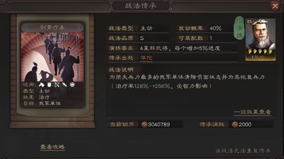 再看周瑜这边的战法搭配,思路也是围绕着他神火计需要频繁发动主动战法这个特点来展开。夺魂挟魄同样是他非常好的选择,高发动率能频繁触发属性偷取,配合神火计的触发频率,可以不断削弱敌人并强化自身。刮骨疗毒也是一个不错的搭配,能为队伍里损失兵力最多的武将清除负面状态并恢复兵力,提供关键的续航支持。如果想要追求更极致的输出,落雷和风助火势这类高发动率或具有联动效果的谋略战法也很适合他,比如风助火势在目标处于灼烧状态时能打出额外伤害。给周瑜选战法,发动概率高的主动战法是优先考虑的方向,这样才能最大程度触发他的神火计,打出成吨的群体伤害。